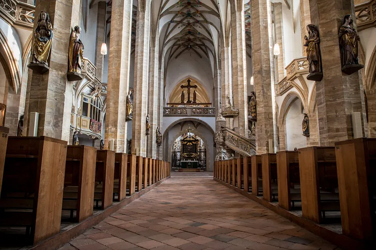 Der Freiberger Dom ist eine gotische Kirche und das sieht man vor allem im Kirchenschiff. Hier fallen dir bestimmt die schlanken, achteckigen Pfeiler auf, die das Rippengewölbe stützen. Vorher stand hier ein romanischer Vorgängerbau, der um 1180/90 entstand. Den Titel Dom St. Marien erhielt die Kirche 1480. Im Jahr 1484 wurden große Teile der Kirche durch einen Stadtbrand zerstört. Danach begann der Wiederaufbau und der Baustil wandelte sich von der Romanik zur Gotik. Aus der romanischen Basilika mit hohem Mittelschiff und niedrigeren Seitenschiffen wurde eine gotische Hallenkirche, deren Deckenhöhe überall gleich ist. Im Chor ist die Decke niedriger, da Sie aus dem Jahr 1386 erhalten ist.