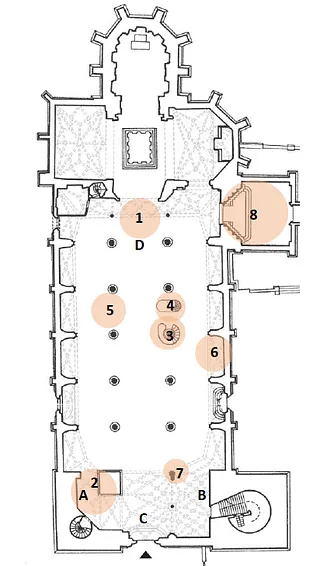 Misst die Breite des Doms von Wand zu Wand (Strecke AB), die Höhe vom Punkt E bis zum bemalten Gewölbe und die Länge vom Eingang bis zur Altartreppe (Strecke CD).