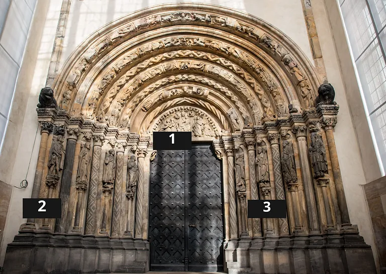 Diese Pforte hier ist komplett aus Sandstein gefertigt und wirkt wie ein riesiges Bilderbuch. Überall seht ihr Figuren aus der Bibel – Engel, Könige, Königinnen und andere wichtige Gestalten aus dem Alten und Neuen Testament.